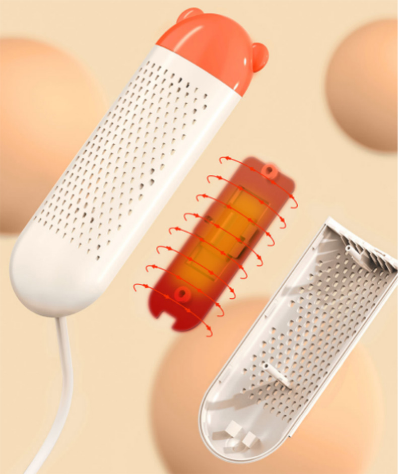 烘鞋器可以去除鞋子中的水分,并配有带紫光灯的杀菌装置,可以消除细菌的滋生。 带有底部电缆出口保护器,使电缆不易断裂,更耐用,适合日常使用。 该干燥装置适用于运动员、渔民、滑雪者和生活在雨区的人们。 适合居家日常生活的实用产品。 适用于皮鞋、布鞋、靴子、雨鞋、手套